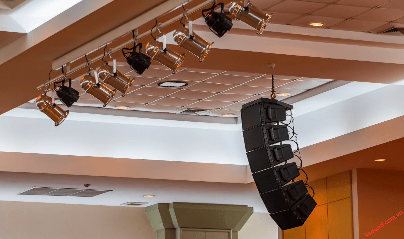 - Cách lắp đặt hệ thống âm thanh hội trường có sử dụng loa array thì phải treo loa.